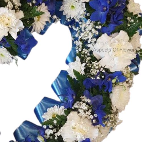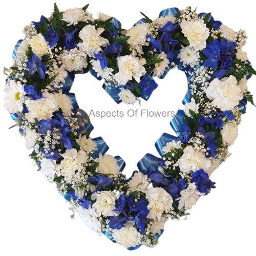 Blue and White Loose Open Heart. This beautiful tribute is composed of a variety of blue and white flowers, with a delicate finish provided by delphinium, carnations, and gypsophilia.