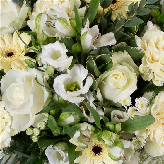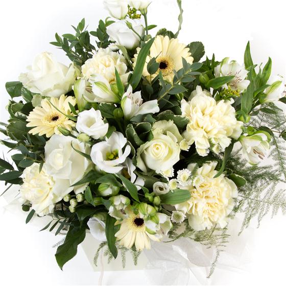 A delightful gift bag of pale lemons and whites, including roses, gerbera, carnations, alstromeria with wispy asparugus fern.