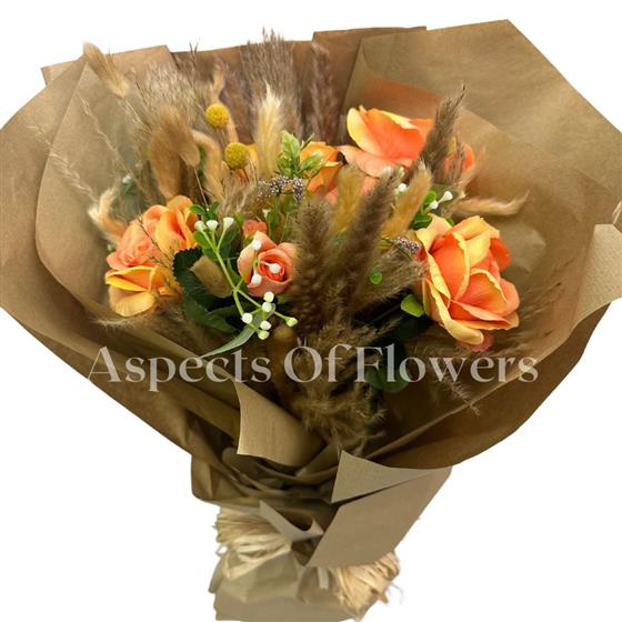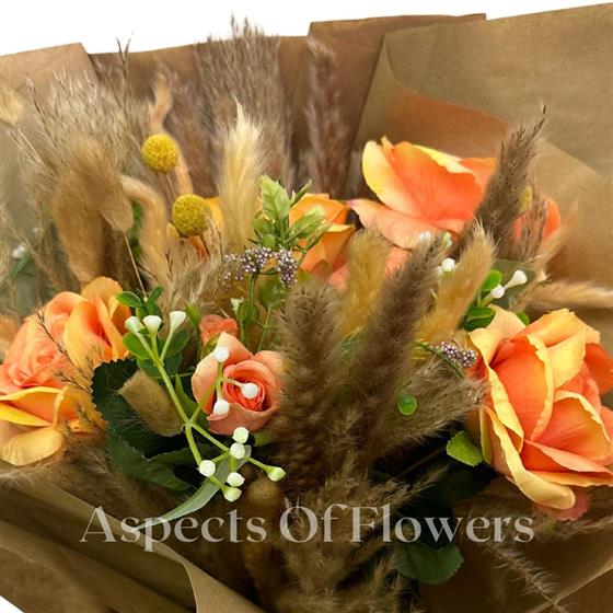 Peachy Paradise tied bouquet features beautiful artificial peach roses and pampas grass. The soft peach colour of the roses is complemented by the natural beige colour of the pampas grass, wrapped in natural brown eco-friendly paper with a raffia bow.