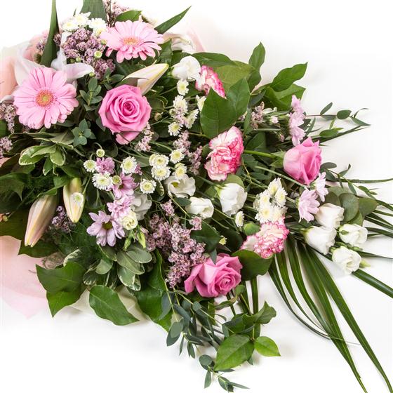 A traditional style bouquet in shades of pink and cream, including roses, chrysanthemums, lisianthus & limonium.