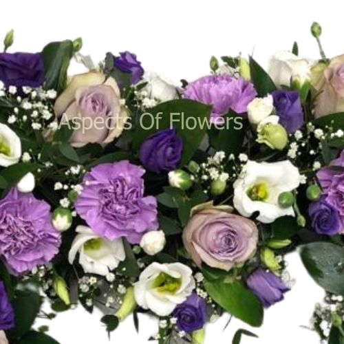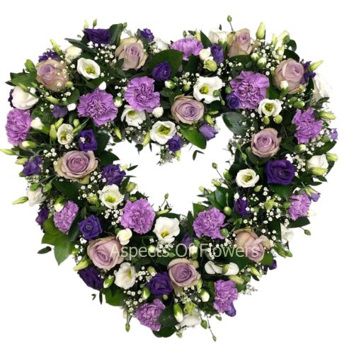 The Lilac loose Open Heart is a beautiful arrangement that is perfect for expressing your sympathy. The blooms are a stunning combination of lilac roses, lilac carnations, and Purple and white lisianthus, accented with gypsophilia. This open heart design will surely convey your deepest condolences.